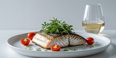AI Generated. Grilled fish served with arugula and cherry tomatoes on a white plate with white wine in the background