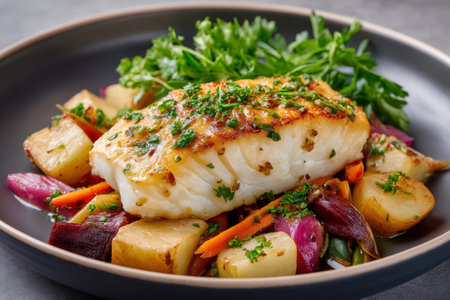 Grilled cod fillet seasoned with fresh parsley and spices served on roasted root vegetables such as potatoes, carrots, beets and onions