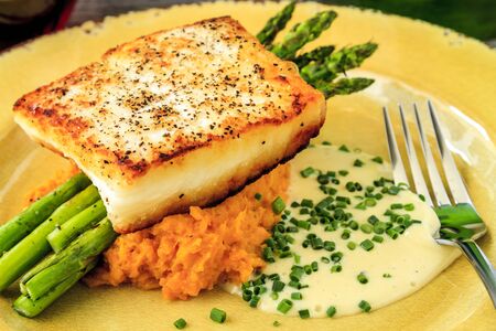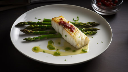 Nordic Delight: Exquisite Close-Up of Modern Style Traditional Fried Skrei Cod Fish Steak with Green Asparagus and Potatoes