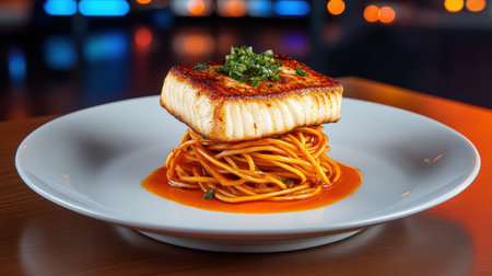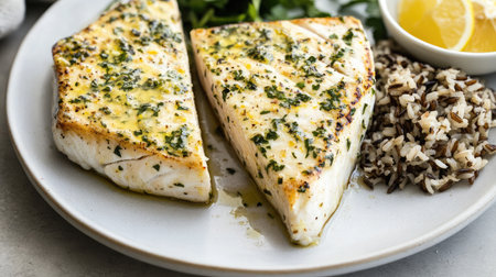 A beautifully cooked cod fillet served with a rich beurre blanc sauce, garnished with herbs, captures the essence of fine dining in a warm atmosphere. Generative AI