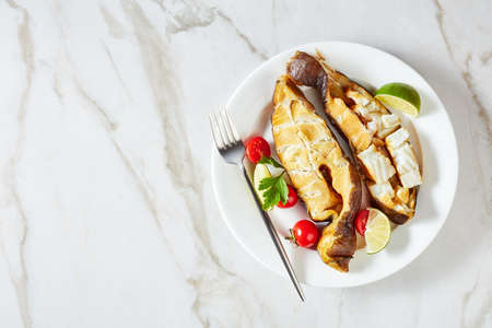 Grilled fish fillet with lime and herbs on white plate, AI Generated