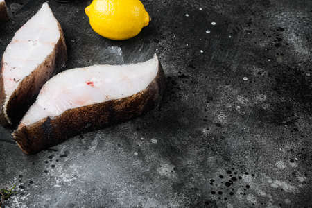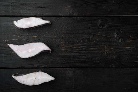 Slices of white fish seafood market set, on black dark stone table background, top view flat lay, with copy space for text