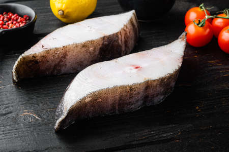 fresh steak raw fish halibut on the stone with the salt and herbs on wooden background