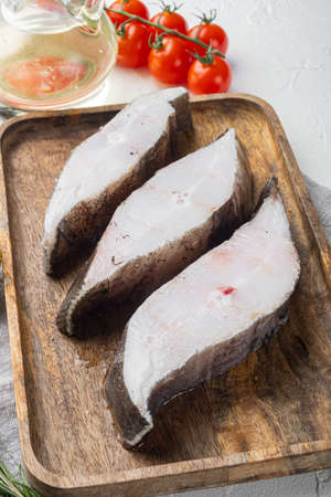 Raw fish steak set, with ingredients and rosemary herbs, on white stone table background
