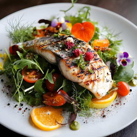 A beautifully plated fish dish garnished with vibrant edible flowers, herbs, and sauces, showcasing culinary artistry and elegance.