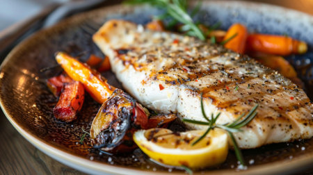 A beautifully plated grilled fish topped with lemon and fresh herbs, served with colorful vegetables. Perfect for healthy meals and gourmet dining.
