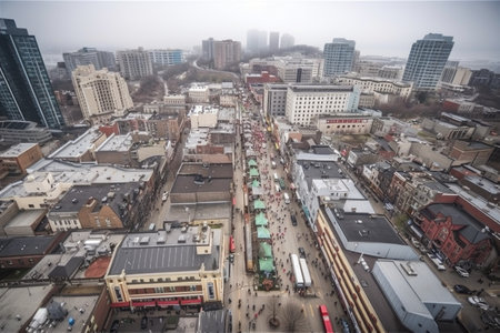 aerial view of busy downtown, with drone capturing the hustle and bustle, created with generative ai
