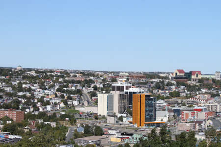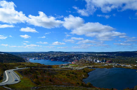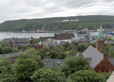 St John's Harbour in Newfoundland Canada. Panoramic view of the city. Warm summer day in August from atop the Historically famous Signal Hill in St. John's.
