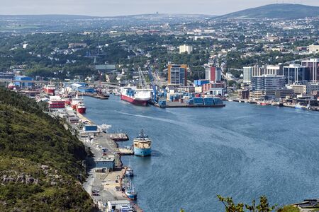 ST. JOHN'S, NEWFOUNDLAND AND LABRADOR, CANADA - JULY 14, 2017. Offshore supply vessels in the port of St. John's after returning from the offshore oil production fields, taken on July 14, 2017, in St. John's.
