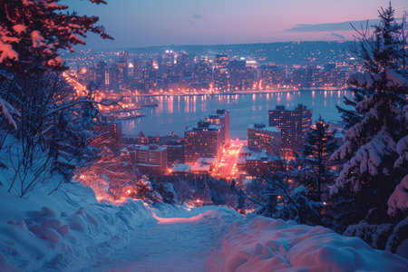 A stunning nighttime cityscape showcases illuminated skyscrapers and glimmering reflections in glass buildings. This vibrant winter scene captures urban beauty and energy.