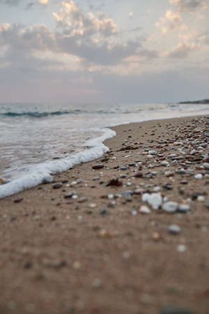 Small stones with sea wave on the beach at sunset time.