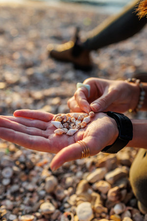 a girl sits on the beach and collects different shells. collection of shells. girl's hands with shells close-up. rest and meditation.