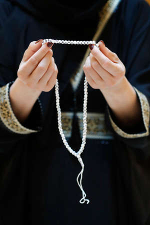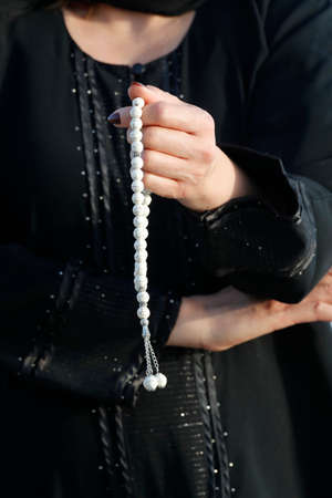 Close up view of a Muslim woman hands in abaya while holding rosary with her hands and praying. Religion praying concept. United Arab Emirates