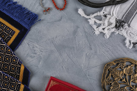 Flat lay composition with Muslim prayer beads, Quran and space for text on gray background