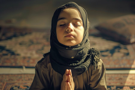 Arabian school girl praying in Muslim. Cinematic effect