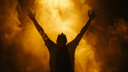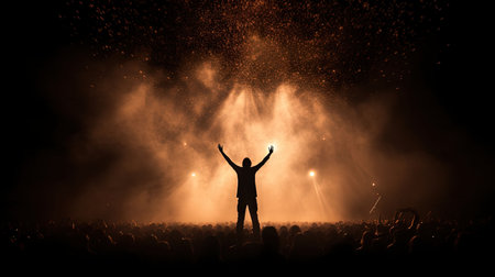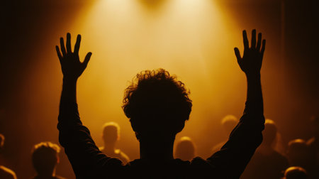 A silhouetted individual stands with raised hands in front of a warm light, amidst an unseen crowd, evoking emotions of celebration and connection.