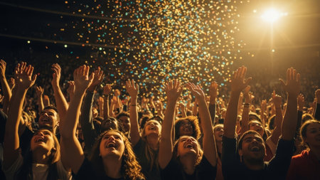 Cheerful concert audience, hands up, confetti falling, bright stage lights