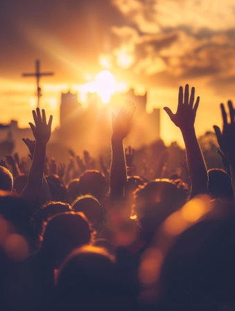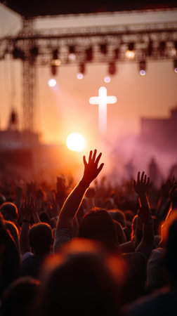 A worship crowd concert festival cros sunset praise music joyou worship crowd at outdoor concert festival cros glowing at sunset with raised hands