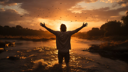 A man with hands outstretched to heaven in devotion to God Generative AI Illustration.
