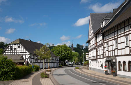 SCHMALLENBERG, GERMANY - JUNE 12, 2020: Image of old half-timbered houses against blue sky in summertime on June 12, 2020 in Oberkirchen, Schmallenberg, Sauerland, Germany