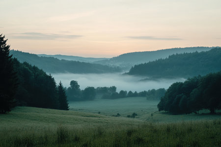 At dawn, a tranquil valley is covered in mist, revealing rolling hills and lush greenery in a peaceful countryside setting.