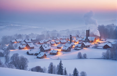 Snowy Winter Village at Dusk With Warm Lights Glowing From Cozy Homes