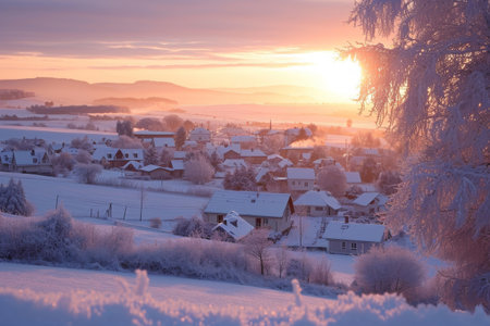 The sun casts a golden glow as it sets over a village covered in snow, creating a picturesque winter scene, A frosty winter sunrise over a sleepy village, AI Generated