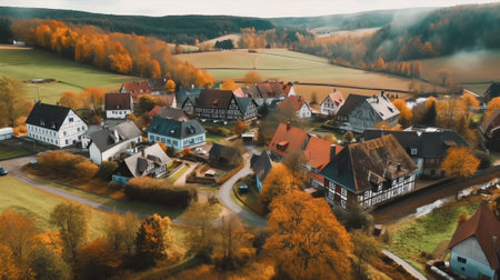 Charming Autumn Village with Cobblestone Streets and Colorful Foliage. Concept of Fall Season, Quaint Architecture, Scenic Pathway, Picturesque Rural Landscape. Banner.