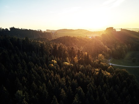 Sunset over the Moravian-Silesian part of the Czech Republic in the Beskydy mountains. Orange glow of the sun in the early evening over a mixed forest. Wilderness.
