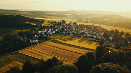 Small town village during the sunrise with fog. surrounded by hills in lower austria. Aerial drone photo