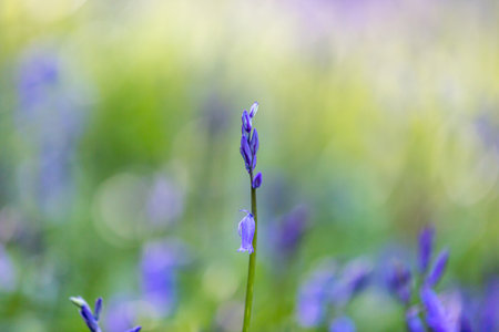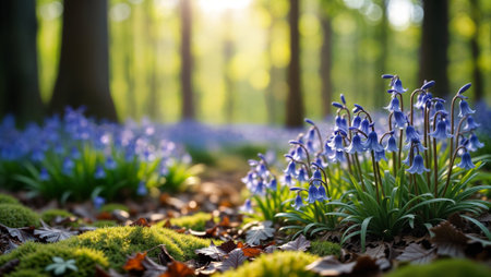 Springtime forest landscape with blooming bluebells purple flowers