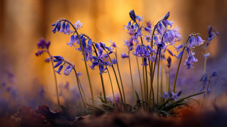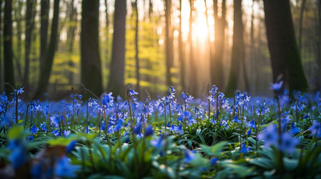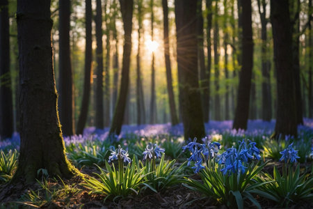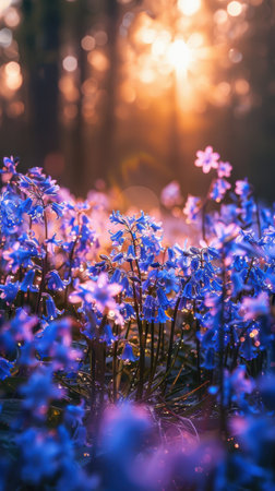 A field of bluebells is illuminated by the golden rays of the rising sun in a dense forest. The delicate flowers are bathed in the soft light, creating a magical and serene atmosphere.