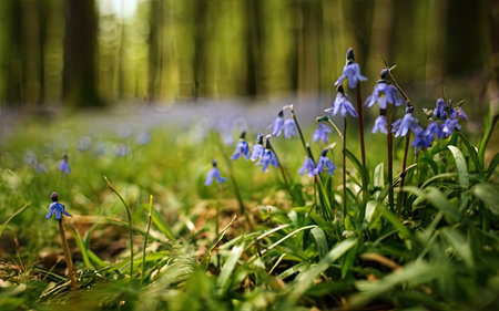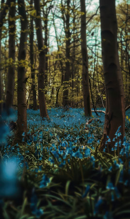Blue blossoms grace the landscape of a springtime forest