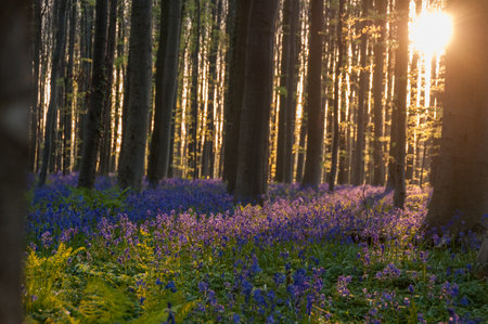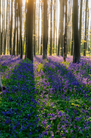 The rising sun illumingating a flowerbed of bluebells in the Hallerbos, on an early spring morning.