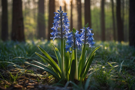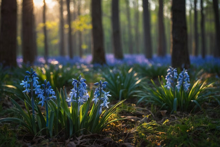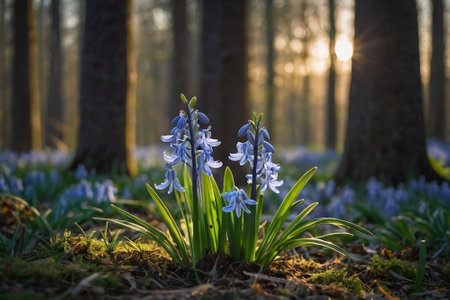 Beautiful blue hyacinths blooming in the forest at sunrise