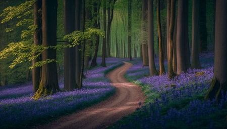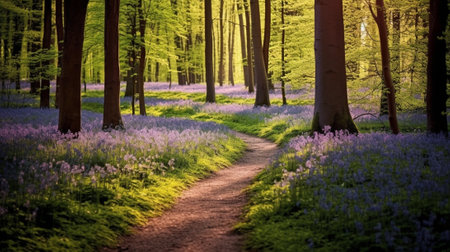 Generative AI : Footpath in springtime beech treesFagus sylvatica forest with blossoming bluebells Hyacinthoides nonscropta blue purple flowers carpet