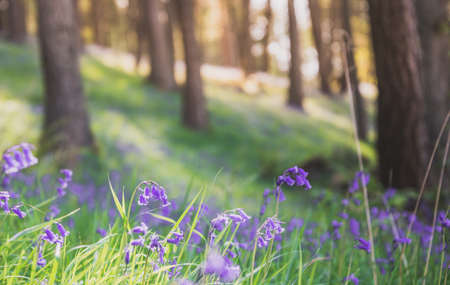 Beautiful bluebells blooming in the forest at sunset.