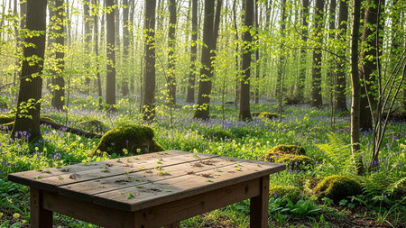 Wooden table in the forest with bluebells and green moss
