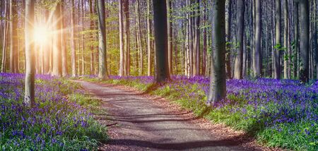 Path through bluebells forest in Belgium. Panoramic landscape view.