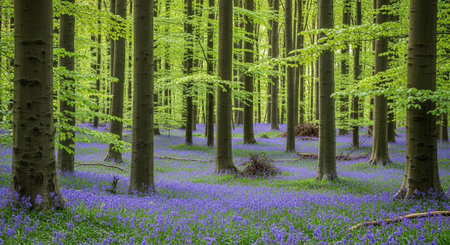Generative AI : springtime in Hallerbos beautiful belgian forest with beech trees ivy and bluebells flowers dreamy nature scenery