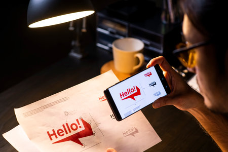 Bekasi - Indonesia May, 11, 2020 : Hi, how can I help? write on smartphone isolated on office desk
