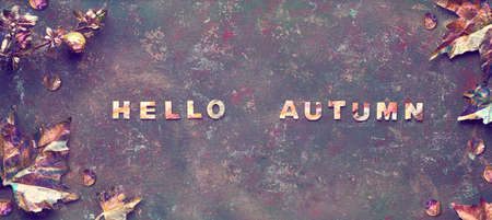 Autumn flat lay with painted golden leaves and text Hello Autumn on dark textured bacgkrdound. Panoramic image, banner composition.