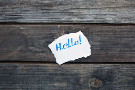Message hello on pink sticky note on wooden board textured background. A black marker wrote word hello on note paper.