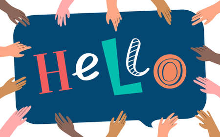 Many hands of diffirent skin color hold a single speech bubble with a message reading Hello. Uniting to support a common case, delivering a shared message, virtual support during times of social distancing. Flat style illustration, isolated on white background, top view.