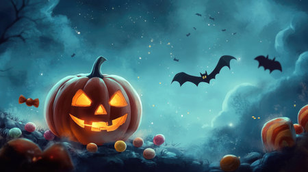 Cute Halloween scene with a smiling pumpkin, candy, and bats, leaving plenty of space for your message.