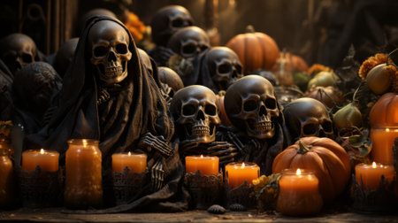 A spooky Halloween scene unfolds with a skull surrounded by pumpkins and autumn leaves Eerie and atmospheric, this cemetery-inspired decoration adds a chilling touch to any home Perfect for capturing the spirit of the season, this image evokes chills and thrills AI Generative