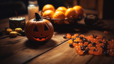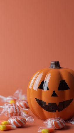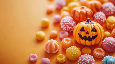 A cheerful, glowing Halloween pumpkin surrounded by bright, playful candies in a clean minimalist style. Perfectly embodies the festive spirit of autumn and Halloweens fun, spooky ambiance with
