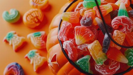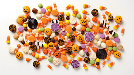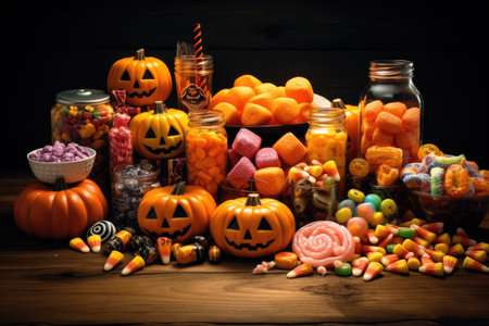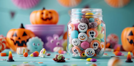A delightful arrangement of Halloween-themed candy and decorations showcasing vibrant pumpkins, playful ghosts, and colorful sweets. Ideal for seasonal events and parties.