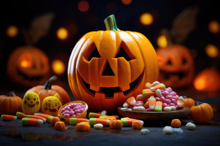 On halloween night, group of grinning jack-o-lanterns and vibrant candy corn decorate space, celebrating colorful produce of fall while bringing sense of joy and anticipation for trick-or-treaters