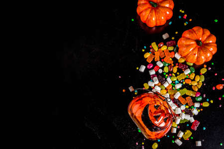 Scary orange pumpkin with delicious and colorful candies, to celebrate Halloween, with a black background, selective focus, concepts, closeup.